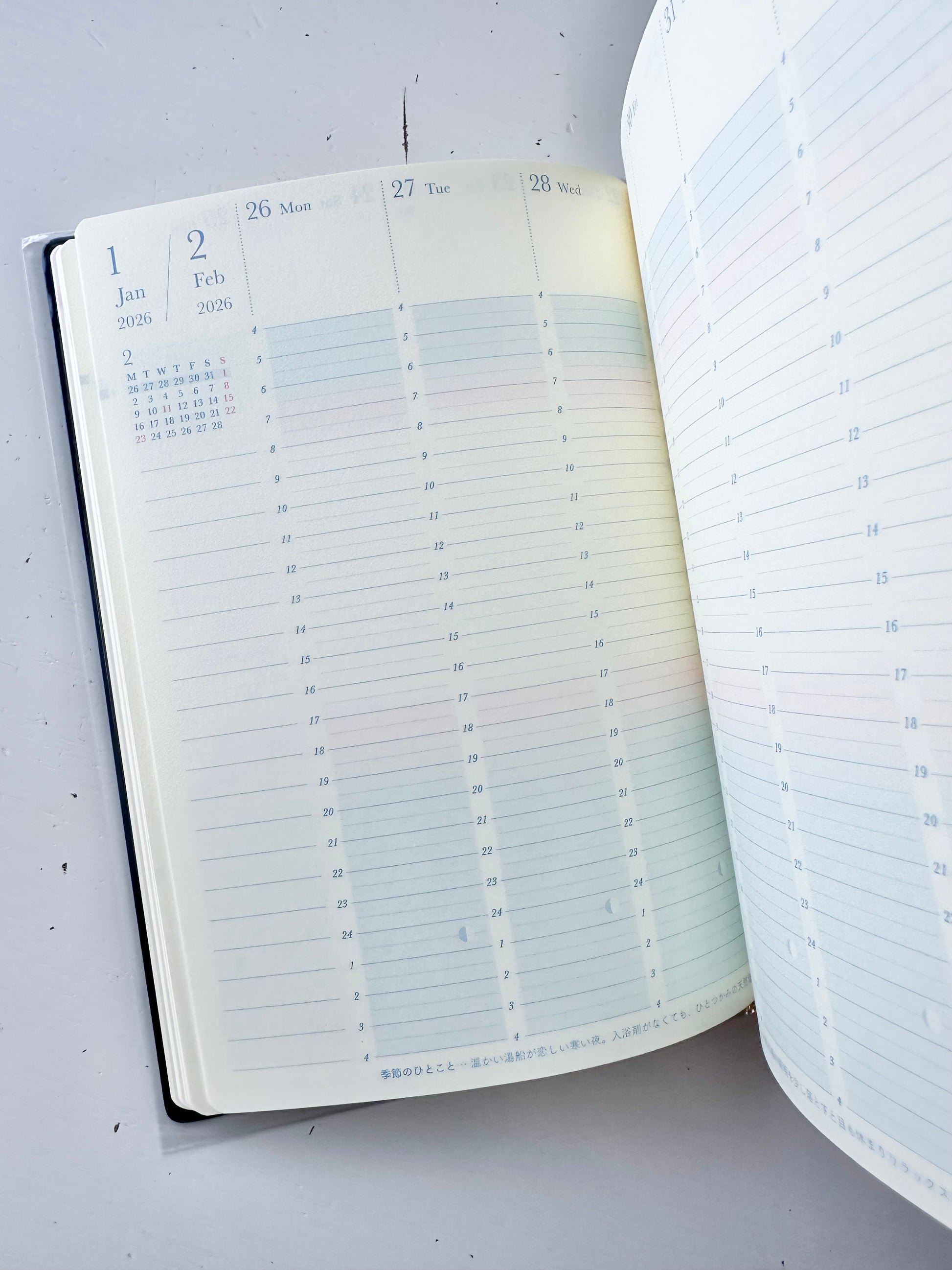 ・The most distinctive feature is the vertical-type weekly page that can be viewed 24 hours a day, with the length of a day expressed in light colour gradations