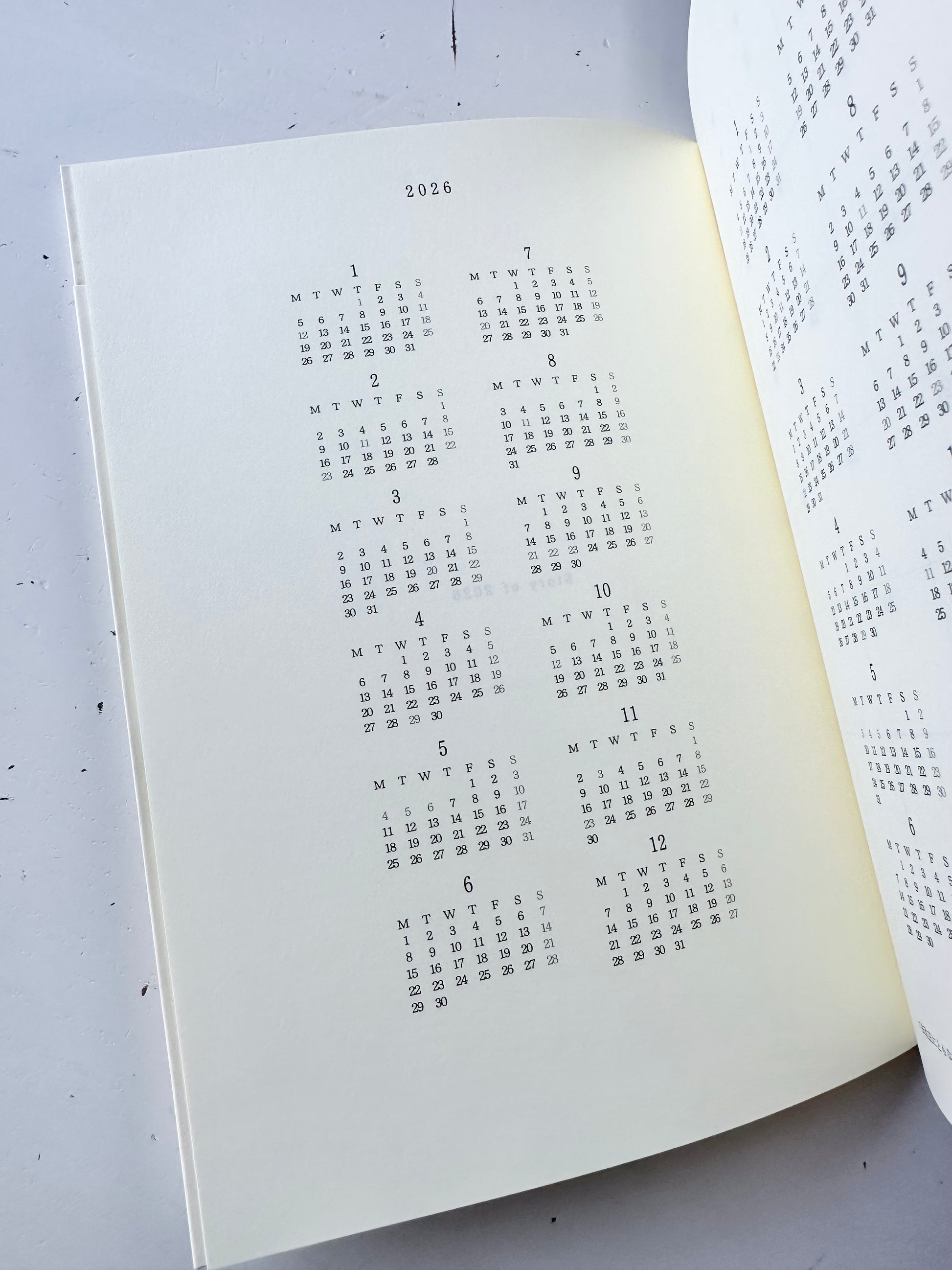 H210 x W148 x D10mm, Total 175 pages (Annual calendar, Monthly schedule, Other pages). Common specification: Paper: MD PAPER / Thread Binding / with index label, with a bookmark string / Made in Japan.